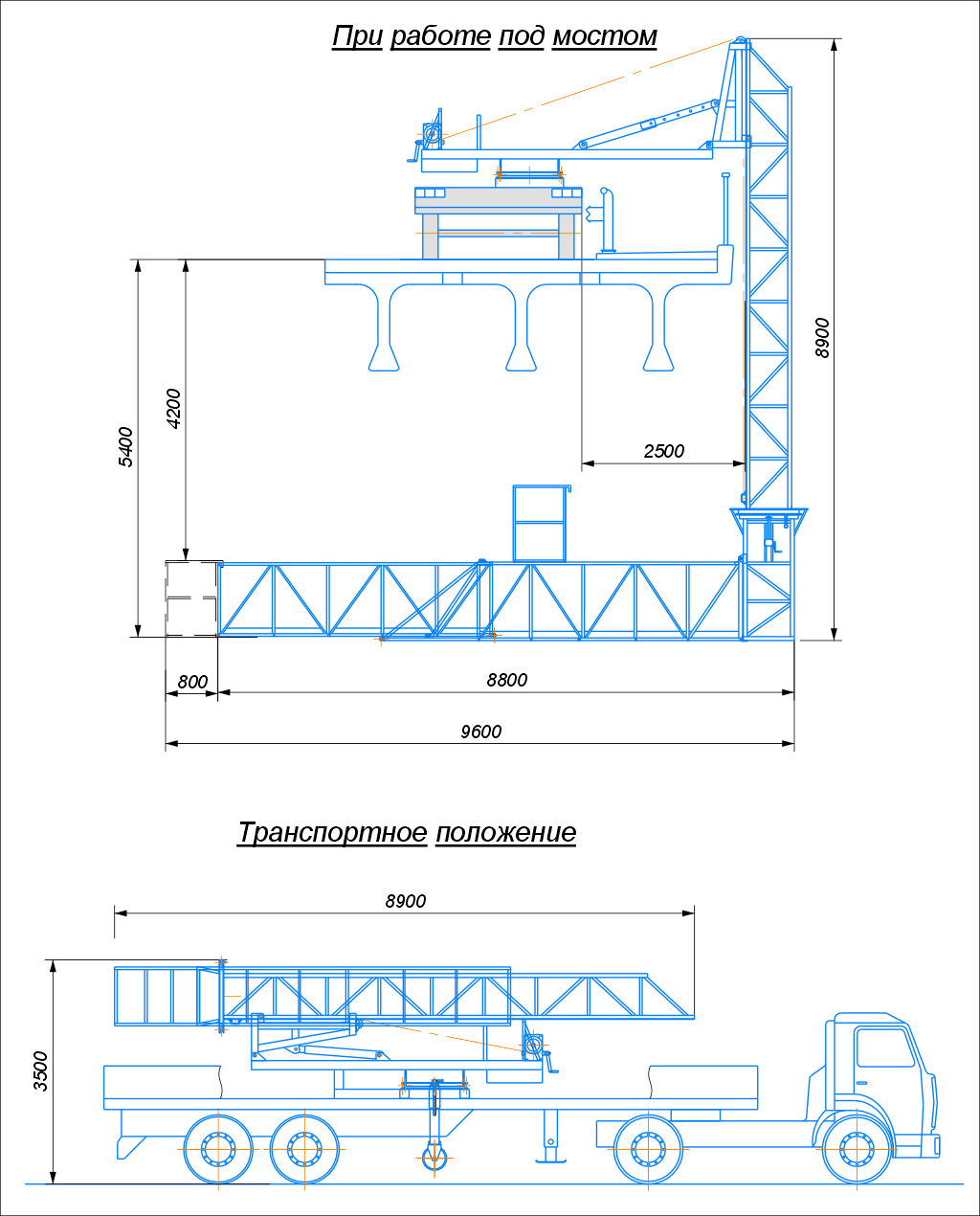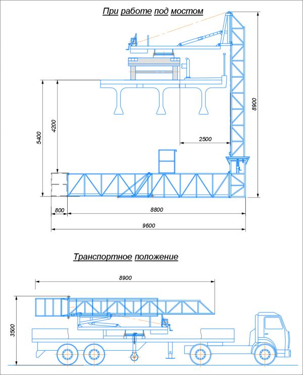 Мостовая платформа предназначена для обслуживания и инспекции нижних и фасадных поверхностей пролетных строений с большой строительной высотой мостов и путепроводов, а так же шириной тротуаров до 2.5м при проведении строительно-монтажных работ.